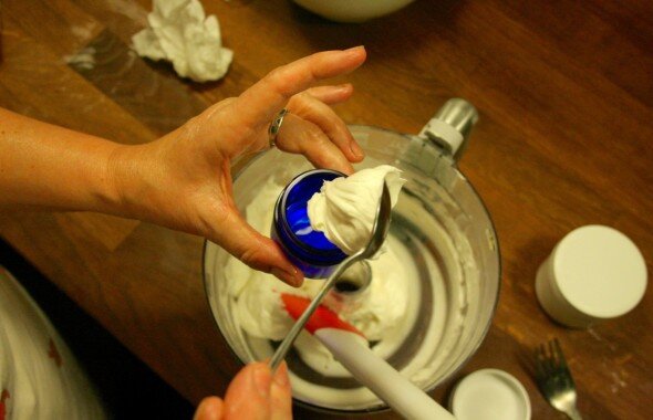 1) Máslo a olej si v daném poměru nechte změknout ve vodní lázni. Máslo se nesmí úplně rozpustit! Poté vyndejte z vodní lázně a přidejte esenciální olej a vitamin E a začněte šlehat.