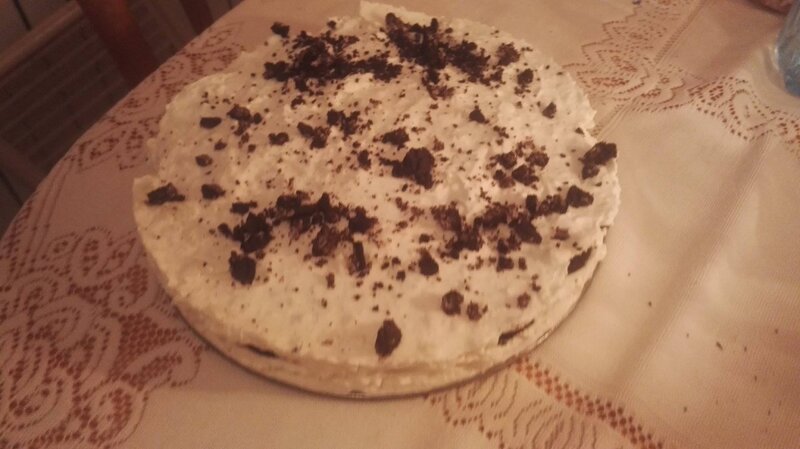 6) Nakonec rozdrtíme sušenky z 1 balíčku oreo sušenek a dort jimi posypeme.