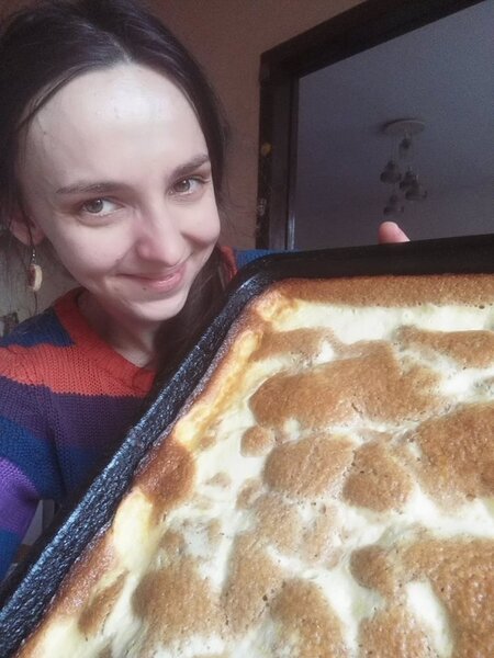 3) Vymažeme si plech tukem. Na něj nejprve vlijeme 1/2 první těsta, na něj pomalu přidáme (lžící) druhé, tvarohové těsto a nakonec vlijeme zbytek prvního těsta.